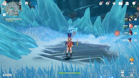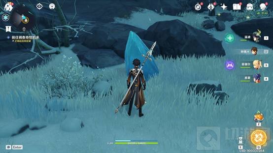 8.接近坚冰时会发现被一层屏障阻挡,完成冰湖中央的挑战任务后屏障解除,之后搜寻周边的深赤之石来击破坚冰。