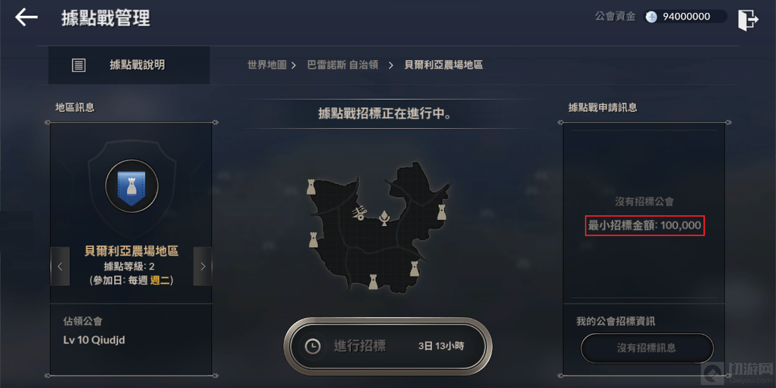 透过「招标」按钮可以进行据点战招标,招标结束后招标从最高金额的公会中的前3个公会并进行据点战。