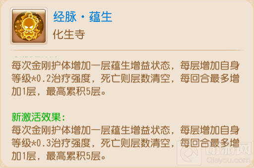 作为本次战斗平衡调整的重点,影响治疗强度的化生寺蕴生经脉得到了明显加强,从“每层增加自身等级*0.2”增加到了“每层增加自身等级*0.3”。这0.1的系数变动看似不多,但实际上却带来了显著的治疗强度提升。