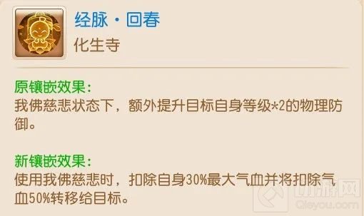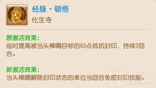 在PVP战斗中,我们经常可以看到刚刚解封就又被小孩卡封上的情况,而顿悟经脉的改动所带来的“当回合免疫封印技能”效果则是完美解决了这一问题,只要带了化生寺,那么就没人能卡封你的输出!