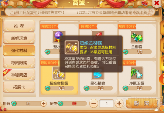 超级金柳露与金柳露的作用相同,使用超级金柳露洗炼所有等级的普通和稀有召唤灵都仅需要1个。