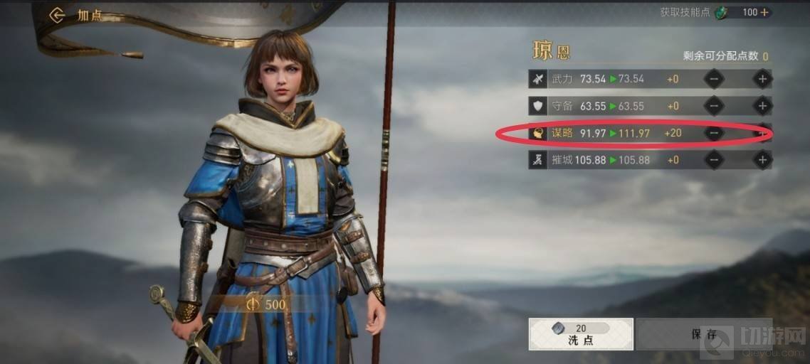 1、琼恩加点全部点谋略直接拉满,琼恩的技能都是受到谋略加成,琼恩造成的伤害会更高,一般在团队中作为辅助位,治疗效果会更好。
