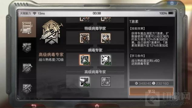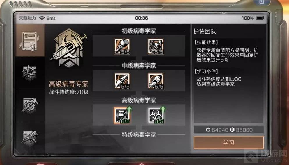 3.初级病毒学家的技能可以不点,一个加采集,一个概率加几个试剂,没用!中级技能左侧必须全点,右侧可根据自己情况点。高级技能建议全点但是优先级不高,主提升自己生存能力。特级技能左侧必点,配合下一阶段的T激素增益全队,配合蓝盾回复大幅提升全队生存能力。