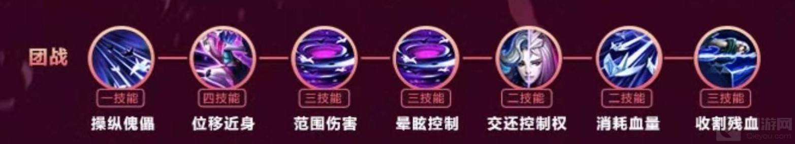 1、团战连招:一技能—四技能—三技能—三技能—二技能—二技能—三技能(1433223)