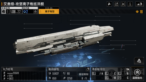 基础型号为离子炮型,虽然配备了导弹与火炮系统,但这两块可以无视,艾奥级的强大之处在于“雷式”离子炮系统,单发600多的能量伤害冠绝全场,尤其是面对战巡、航母这种高抵抗伤害的舰船,能量伤害的优势极大,驱逐的速度,巡洋的装甲,缺点在于前排站位,虽然闪避也不低,但相对来说生存能力还是不强,需要有吸引火力的舰船在前排顶着。