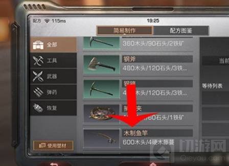 2、接着进入配方列表,向上滑动,然后找到木制鱼竿点制作。