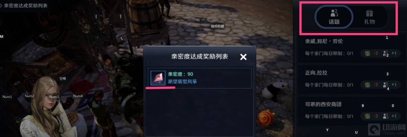3、再点击亲密度,就看到亲密度达到90就能获得她给予的奖励愿望盾型风筝啦。