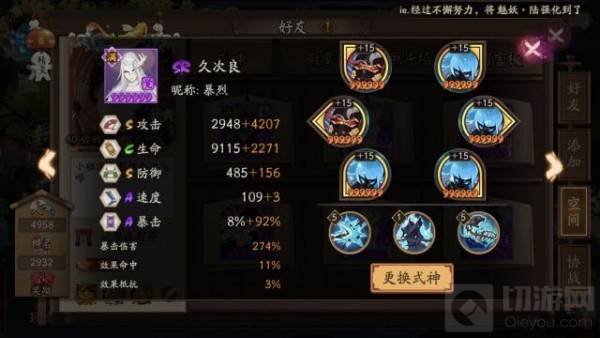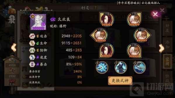 速攻暴或者攻攻暴伤的久次良,走极限输出的路子,一般来说用破势都是攻攻暴伤走极限输出,靠大蛇和琴师拉起来比较多,速攻暴伤的破势,一般是做不出合格输出的久次良需要的场务。