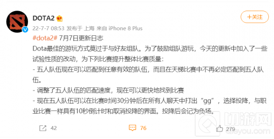 为了优化匹配速度,今后DOTA2将允许非五排队伍,匹配到五排队伍。并且在五排情况下,比赛时间达到30分钟后,玩家就能打出“GG”投降。这几项改动一出,不少玩家顿感世界观崩塌,大呼“爷青结”。