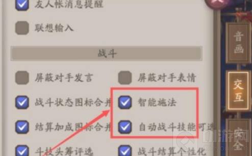 2、跳转面板后,将智能施法和自动战斗技能可选勾选上,最后随便打开一场对决,即可选择技能锁定。