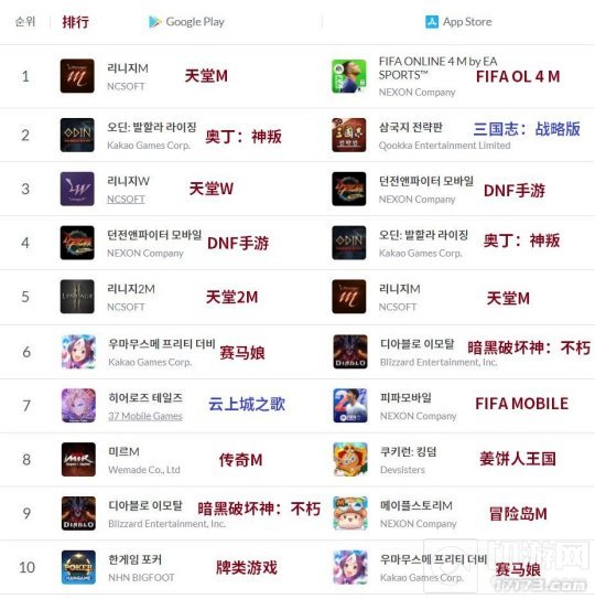韩国地区App Store畅销榜第一,由《FIFA OL 4 M》获得,本周排行上升一位。排行第二,由国产手游《三国志:战略版》获得,排行上升两位;排行第三,由《DNF手游》获得。