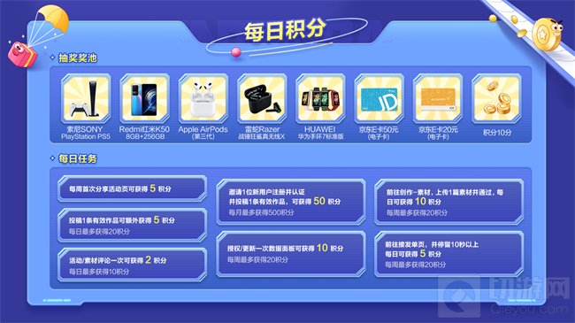 同时,本次夏季创作营还设置了积分抽奖玩法,只要在平台内完成投稿、评论等任务,即可获得积分兑换抽奖机会,赢取索尼PS5、红米K50、AirPods三代、京东卡等丰厚奖励!