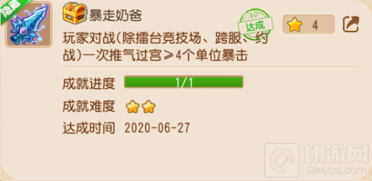 成就内容:玩家对战(除擂台竞技场、跨服、约战)一次推气过宫≥4个单位暴击