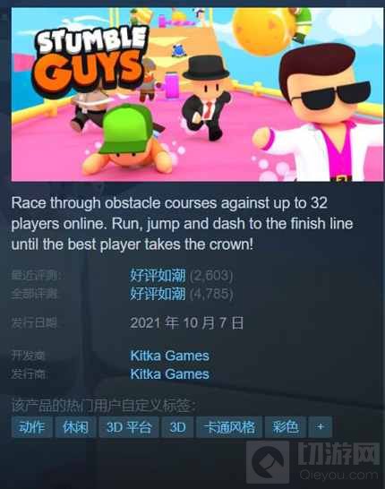 《Stumble Guys》最早发布于2021年10月份,并登陆了Steam平台,当时《糖豆人:终极淘汰赛》的第一波游玩热潮刚过。这两款游戏不管画风还是玩法都非常相近,因此对目标玩家的定位也趋于一致。