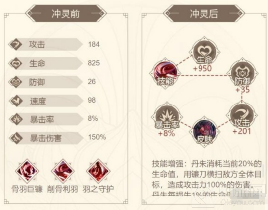 LV1:丹朱消耗当前20%的生命值,用镰刀横扫敌方全体目标,造成攻击力100%的伤害。丹朱每损失1%的生命值,会增加此技能1%的攻击力。