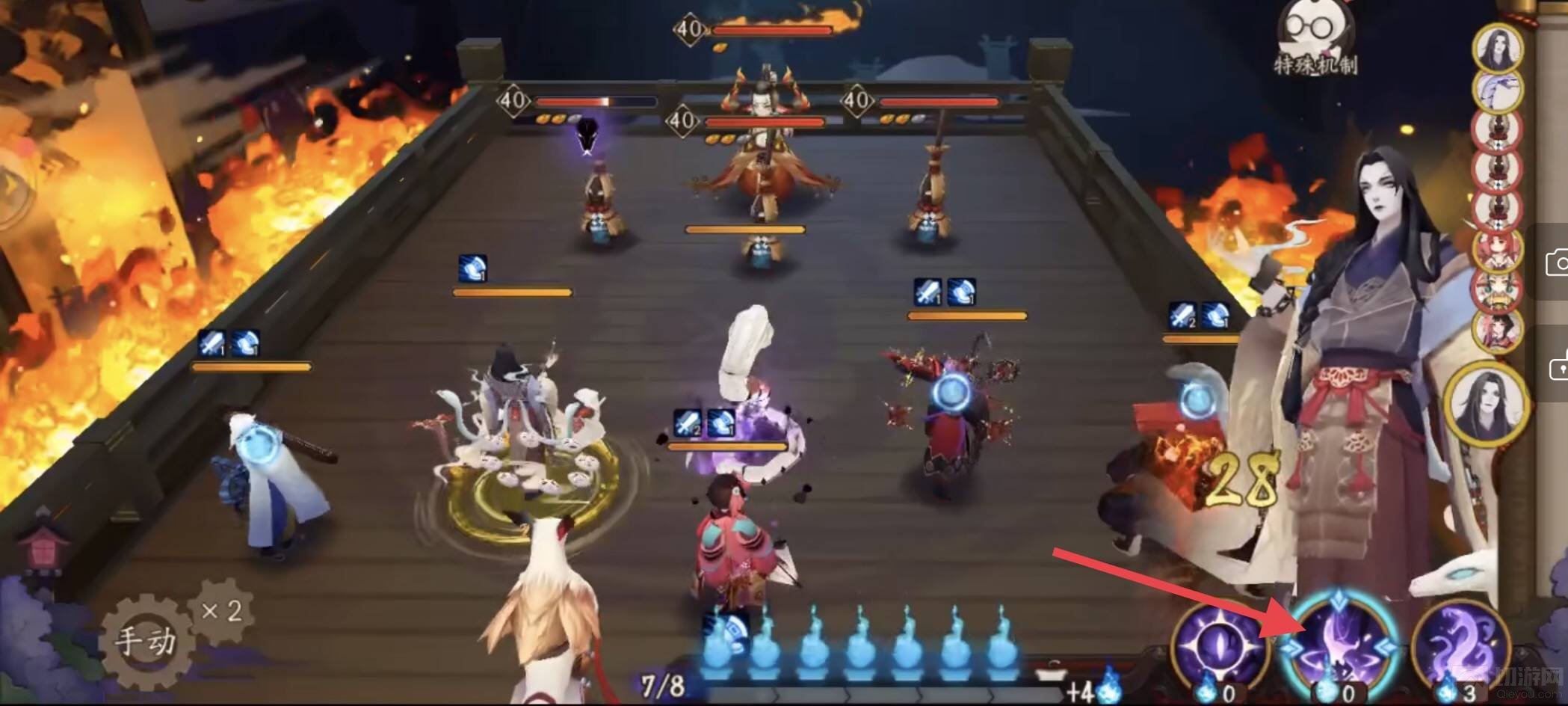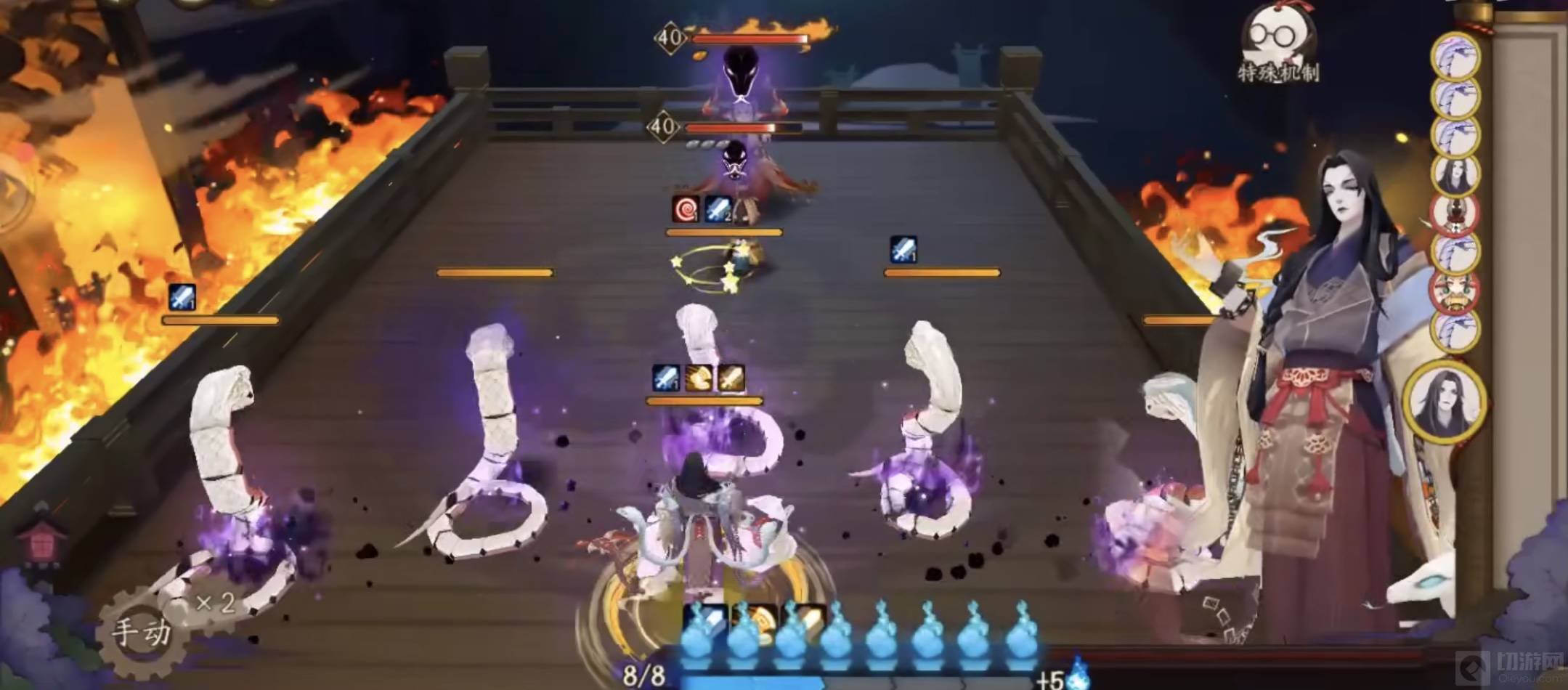 3、当把所有的式神都变为蛇魔后,八岐大蛇就可以用3技能神念之影,使用该技能时每个蛇魔又会有一次攻击的机会。