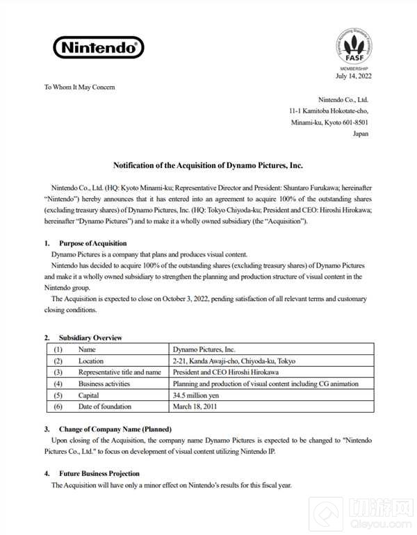 完成收购后,DYNAMO Pictures将被任天堂纳为子公司,并更名为Nintendo Pictures(任天堂影业),旨在强化公司影像内容的企划与创作。