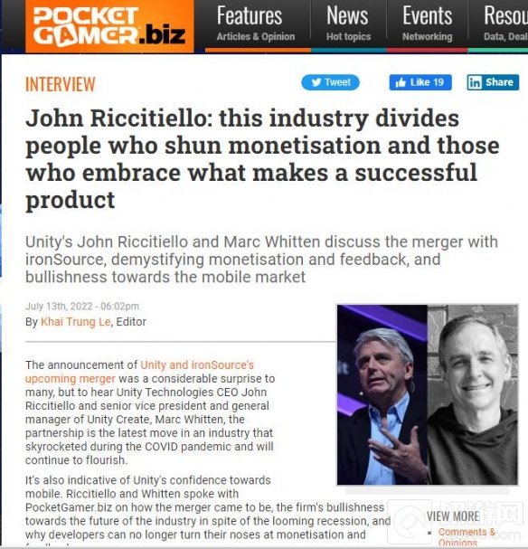 近日,曾任EA CEO现任Unity引擎CEO的John Riccitiello在接受了外媒PocketGamer.Biz的特约采访时谈到了自己对电子游戏开发行业诸多的见解。先是就公司近期的大动态,对Unity即将和以色列互联网巨头、移动广告平台IronSource合并做出的展望,对IronSource联合创始人Tomer Bar-Zeev加入董事会的欢迎。