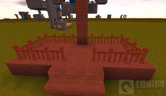 8.电梯的电路控制部分已经完成了,接下来就是做电梯搭载部分,在地面的标记器,周围用红杉木板,搭上一个平台,要搭成怎样的平台视情况而定,当然可以用围栏围起来美化一下;注意:搭载平台后面部分不能超过轴承,上升下降过程中不能与滑动方块有接触,否则电梯会动不了。