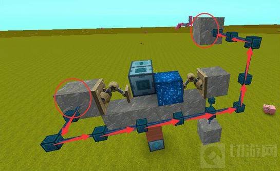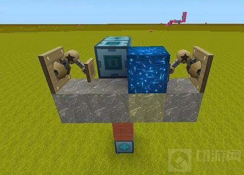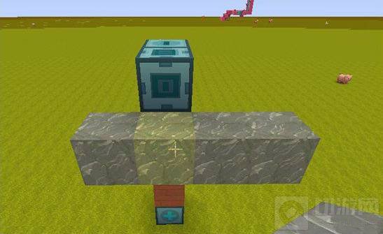 4.在滑动方块的后方往下一格的位置放上横着的四个岩石,这个是用来放机械臂和电石块的,控制滑动方块的通电情况; 注意:四个岩石不能和滑动方块放在同一水平上,要往下一格。