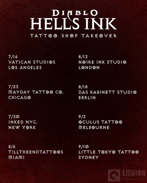 “暗黑地狱墨印”活动已于7月16日开启,9月10日结束,将在美国、英国、德国和澳大利亚的多个城市展开。多位纹身师将在现场,为粉丝纹上暗黑宇宙图案的纹身。