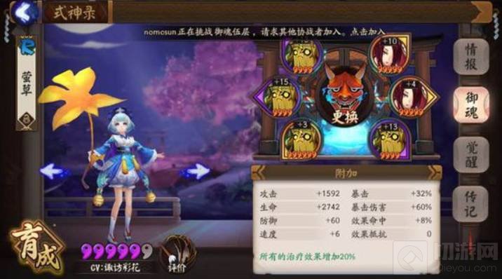 一、莹草是极为吃攻击力的奶妈然后又有A的攻击成长,所以尽量为莹草堆加攻击力是最为正确的选择,所有的百分比御魂选择攻击力百分比。