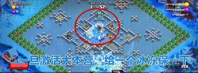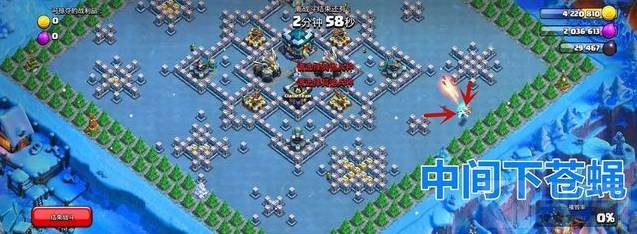 3、接下来的任务就是看好“咏王”和“苍蝇”还有就是把“冰冻法术”握在手中,为下一步的操作做好准备。因为敌方的“部落援军”都是“地面部队”所以用空中部队的目的就是“白嫖”敌方的“部落城堡”只要按照上面的三个步骤来走,这些操作他们都可以自动完成。当“苍蝇”攻击敌方大本营的时候,就会触发“大本营”的攻击,所以这个时候就用“冰冻法术”保一下“咏王”和“苍蝇”。