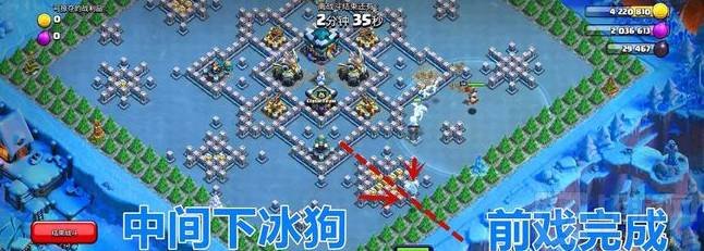 2、等到“咏王和苍蝇”清理掉三点钟方向的“投石炮”以后,在阵型的四点钟方向“大雪花”的中心点靠近树林的地方,释放第二只“寒冰猎犬”目的是勾出六点钟方向的“电塔”同时拉住“投石炮”的伤害,目的也是为“苍蝇”创造输出的环境,做完以上的操作,前戏部分也已经完成了,三星基本上也收入囊中。