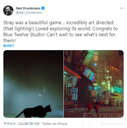 猫咪冒险游戏《迷失》现已正式发售,游戏收到了许多来自各界的好评。顽皮狗工作室的总监尼尔·德拉柯曼也在个人社交账号中不吝啬自己对该游戏的赞美之词。尼尔称《迷失》是一款出色的游戏,作品有着难以置信的艺术指导(灯光!)祝贺Blue Twelve Studio,自己已经迫不及待地想看看他们下一步要做什么了!
