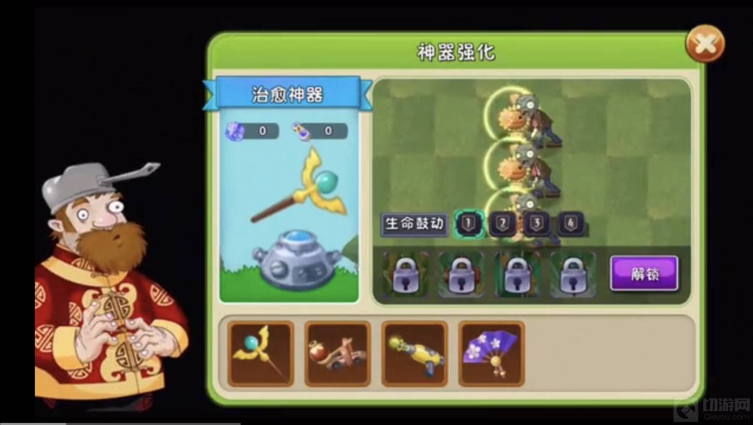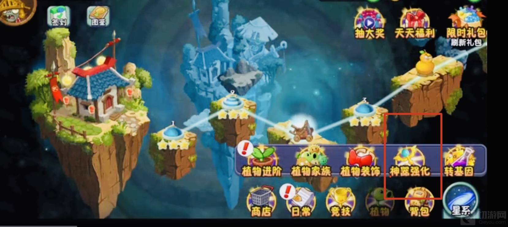 1.在植物大战僵尸2中的第九关与第十关之间有一个神器强化的关卡,点击进去。