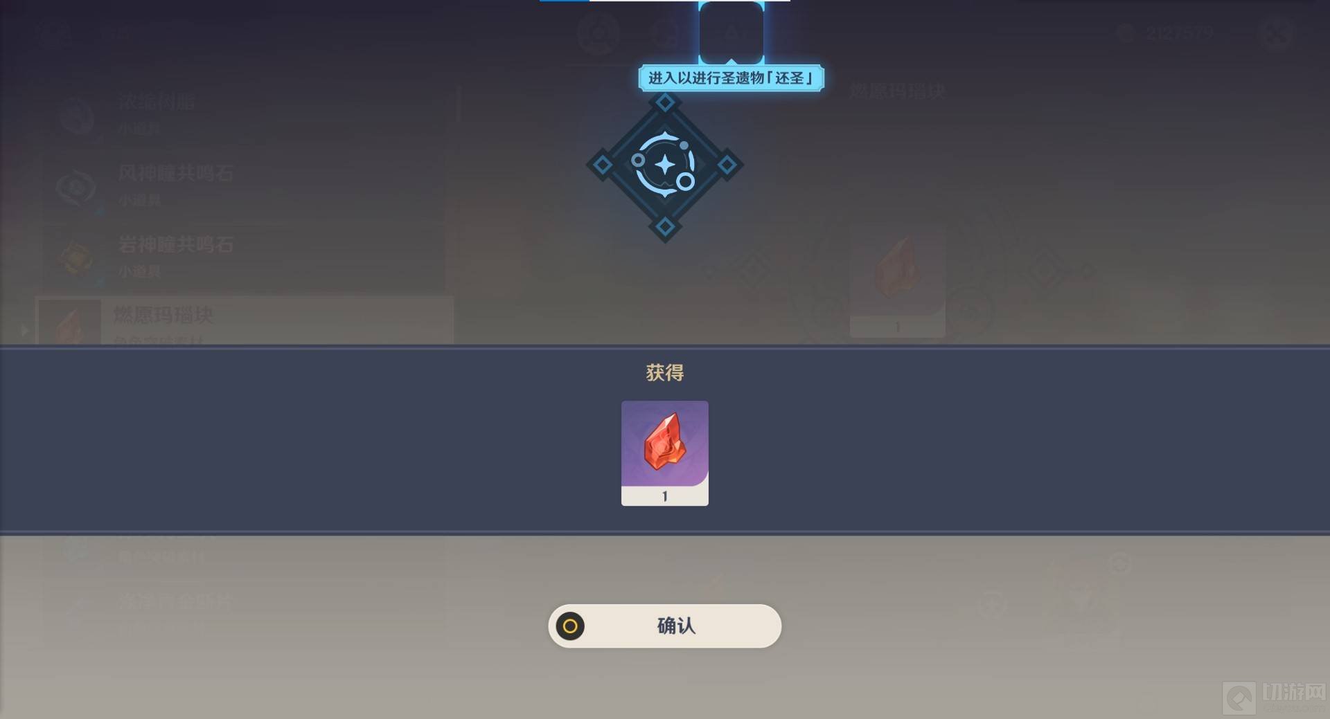 6、再点击使用原粹树脂,这样就可以获得燃愿玛瑙块了。