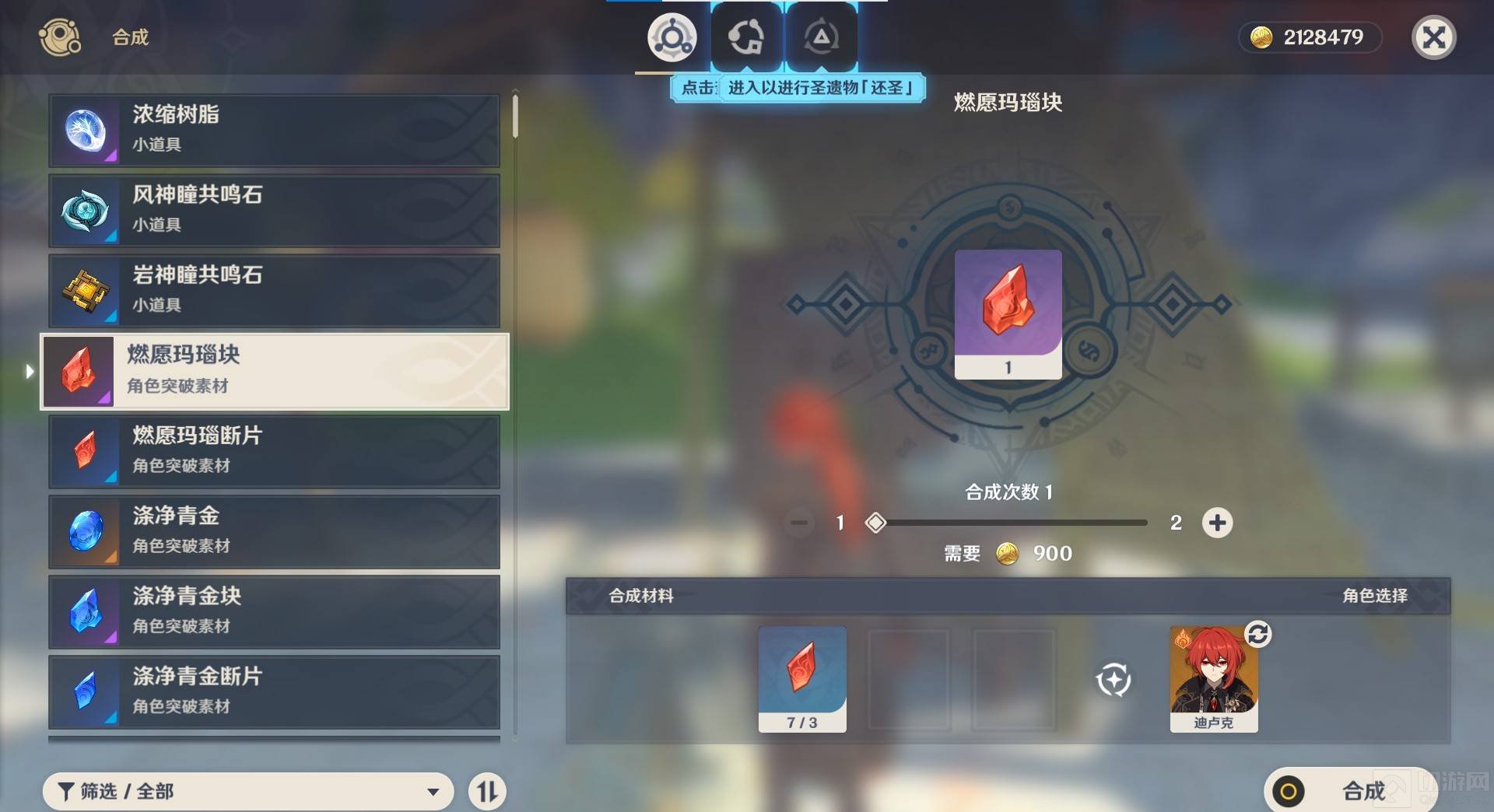 3、点击合成台,进入合成界面,找到燃愿玛瑙块合成。