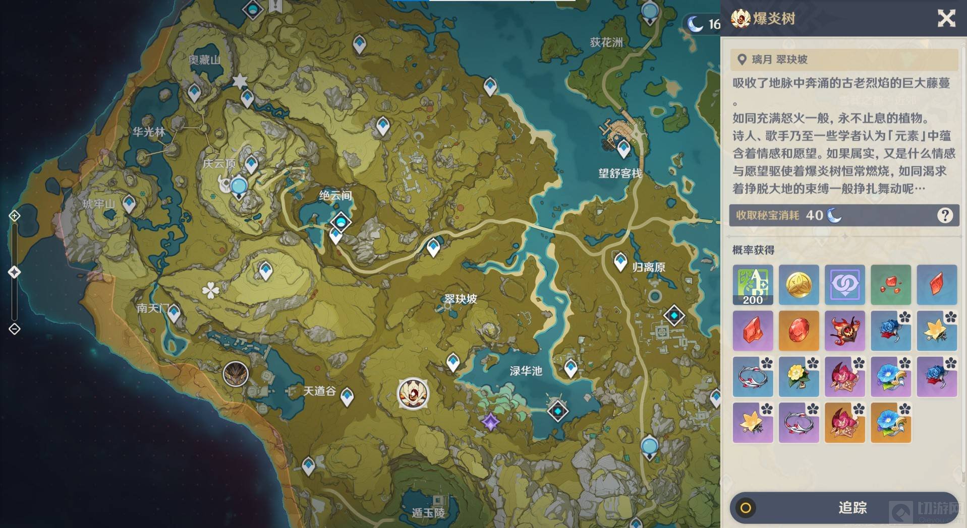 2、在地图里面找到爆炎树或者北风狼,然后点击追踪。