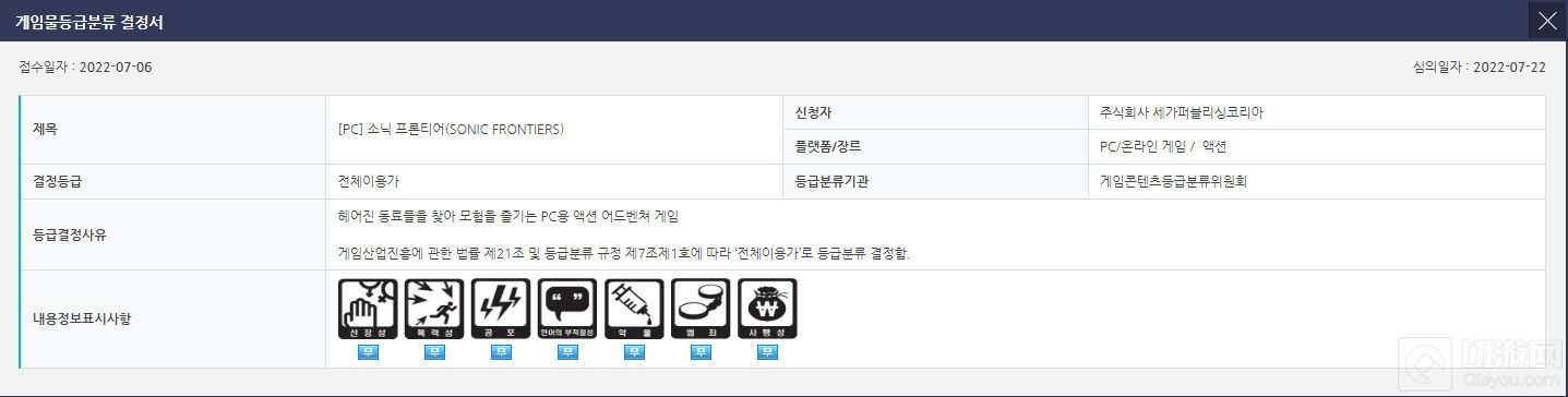 世嘉开放世界游戏《索尼克边境》已在韩国通过评级,显示为全年龄向,评级委员会甚至没有给游戏任何一个单一的内容做出年龄分级警告。