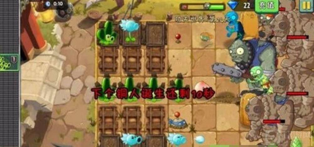 6.需要注意的是在本关卡中,豌豆荚和寒冰射手是主角,配合能量豆可以让玩家有足够的时间消灭巨人,记得寒冰射手要分列排放哦!