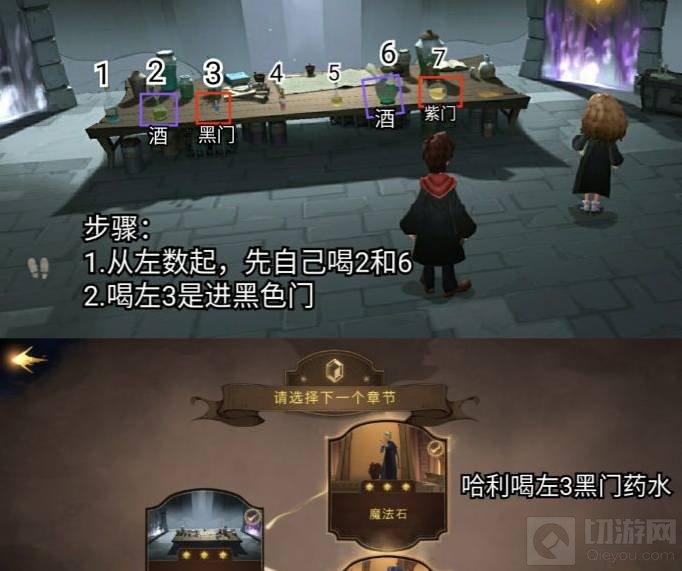 2.桌上一共有7瓶药水,自己先喝从左数的2和6,然后让哈利或赫敏喝左3黑门药水即可;(谁最后喝了黑门药水,下一关就是谁去打奇洛。)