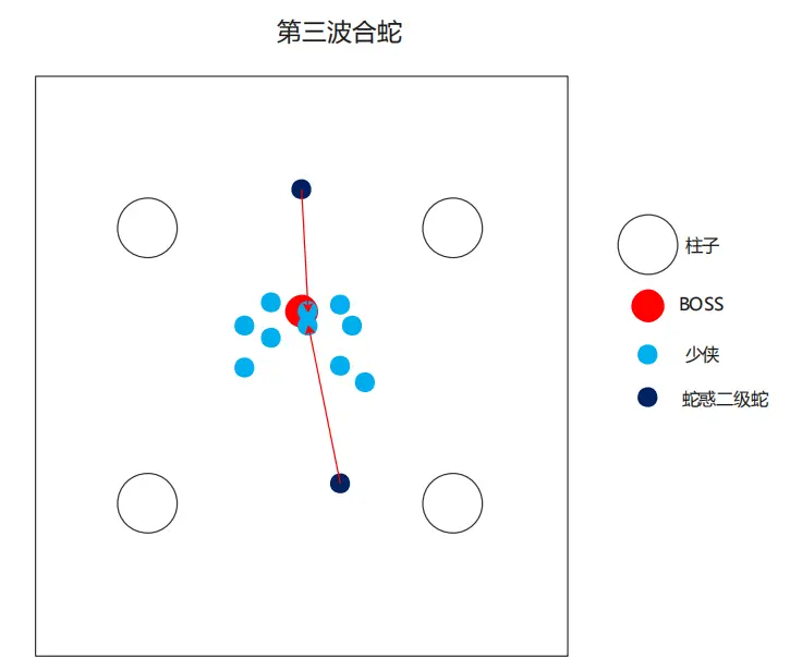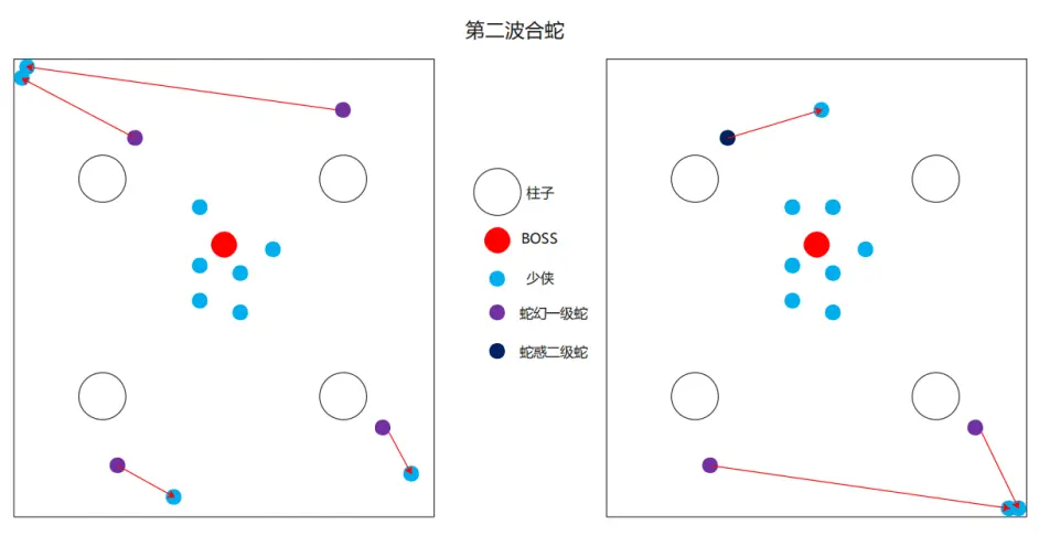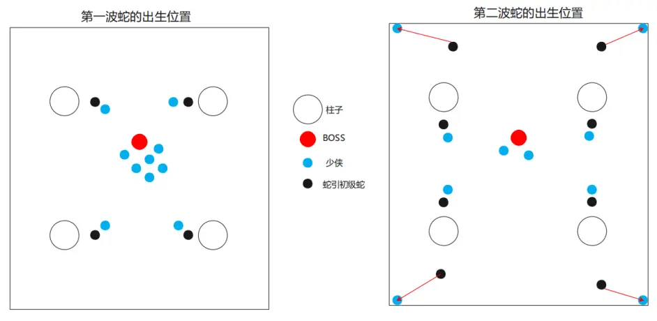 第一波蛇的出生位置在boss面向的前后两侧柱子旁,第二波蛇的出生位置在boss面向的左右两侧柱子旁。