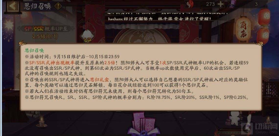 2、自9月15日起,距上次登录超过30天的阴阳师大人回归平安京时将开启专属的‘思归召唤’活动,每日花合战经验达到100可以获得1个思归灵石,阴阳师大人可以选择自己想要的SSR/SP式神放入对应的奖励位置,每个奖励可以通过思归灵石解锁。