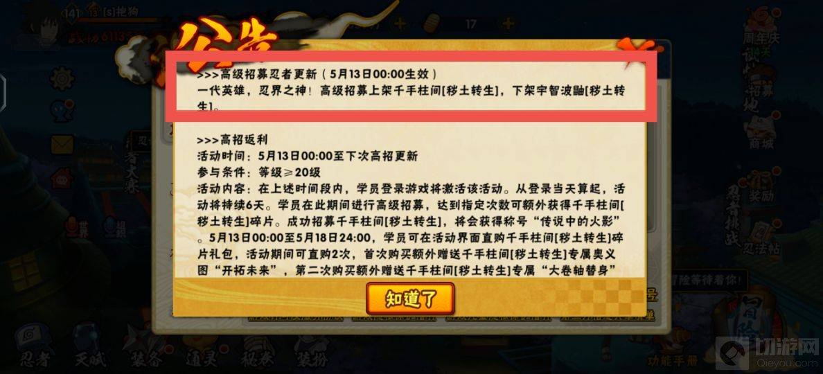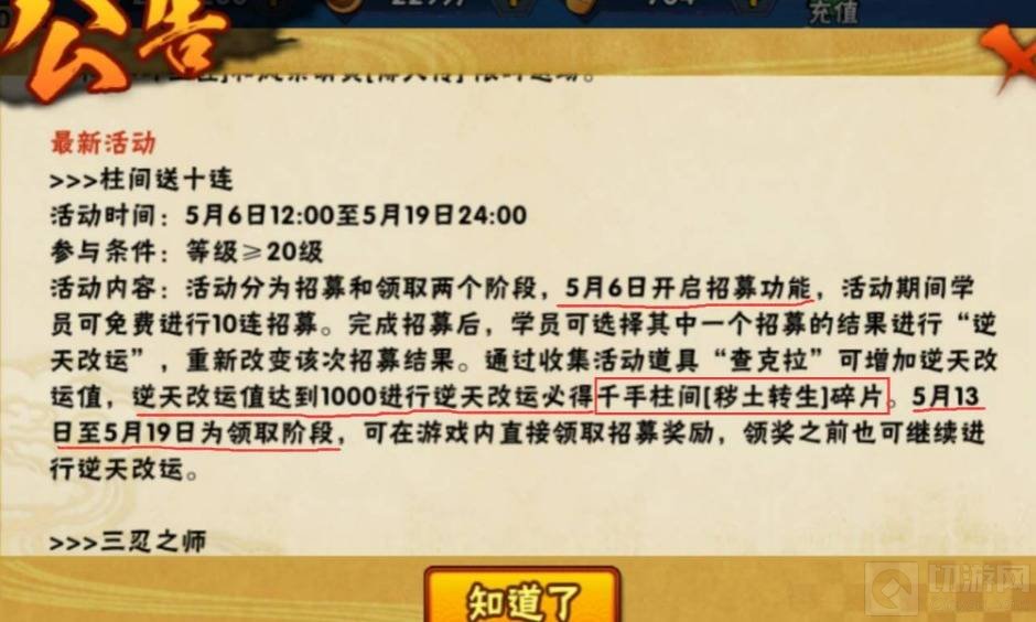 2,同时在5月13日上线于高级招募,可在高级招募中获得柱间碎片,活动还有高招返利,在高级招募到一定次数时可送秽土柱间的碎片。