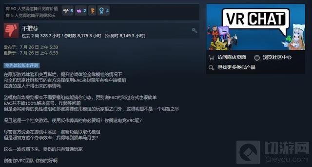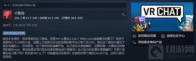 免费大型多人线上虚拟现实游戏《VRChat》7月25日发布了一则“安全更新”公告,宣布为游戏引入EAC反作弊系统,此举一出立刻引起了社区的强烈反对,反馈在Steam测评上,7月26日一天《VRChat》就收到了近7000条差评,目前Steam最近测评已变成“多半差评”(23%好评)。
