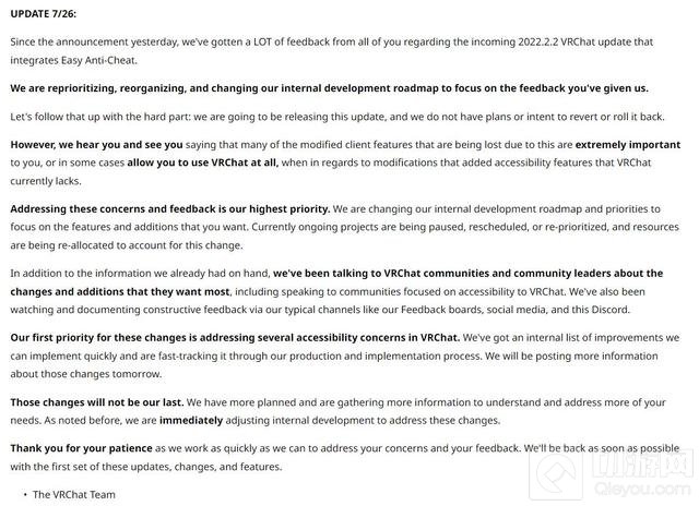 在遭到社区的强烈反对后,7月26日,《VRChat》官方更新了公告表示:他们将继续发布此更新,并没有恢复或回滚它的计划或打算。开发者未来将优先解决玩家们所反馈的问题,并与社区保持积极沟通。