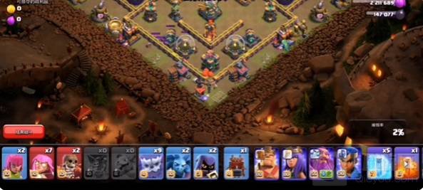 2、右边下闰土,左边地震开墙,下毒药清理小猎犬,然后给女王和投石炮冰冻,右边冰住闰土。冻住大本,女王直接开大打大本。下清边部队,大家等弓箭手锁定攻击女王之后,下弓箭手,猎手。最终等待超级炸弹打一下伤害和冰冻,即可完成3星挑战。