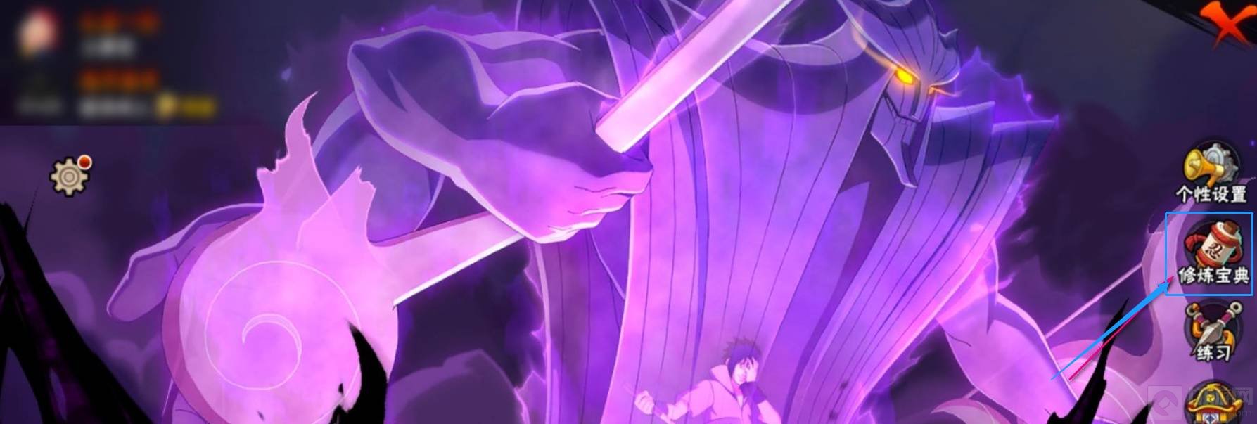 1、先打开火影忍者,点击左侧设置按钮,点击右侧修炼宝典。