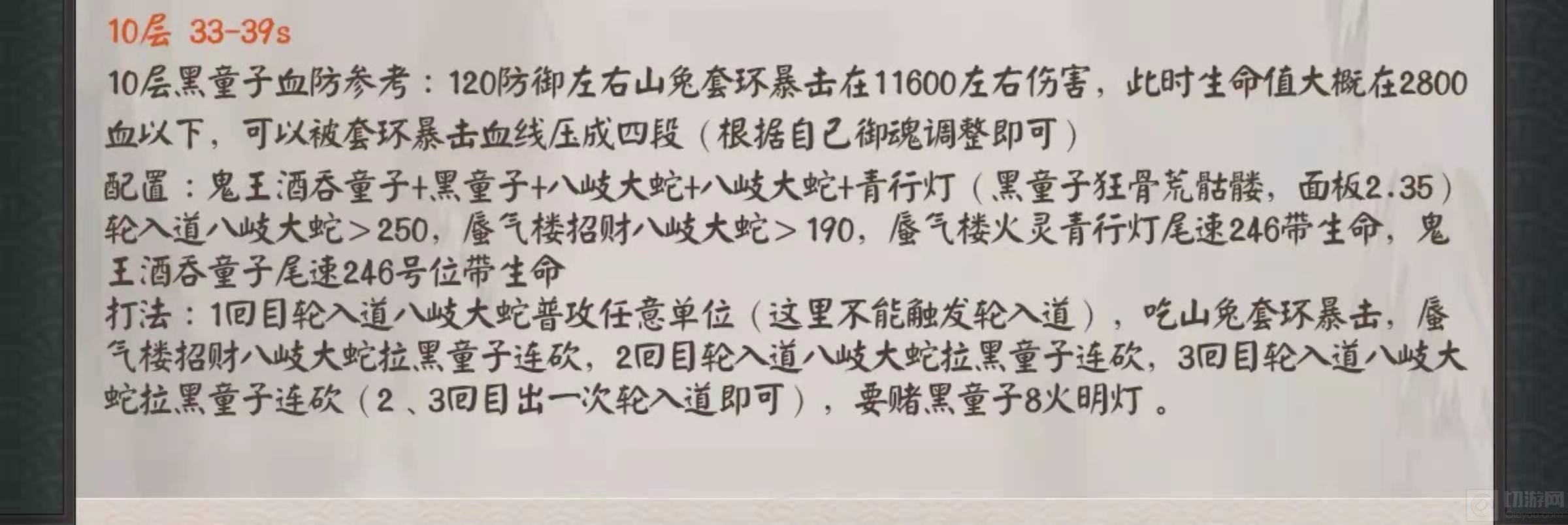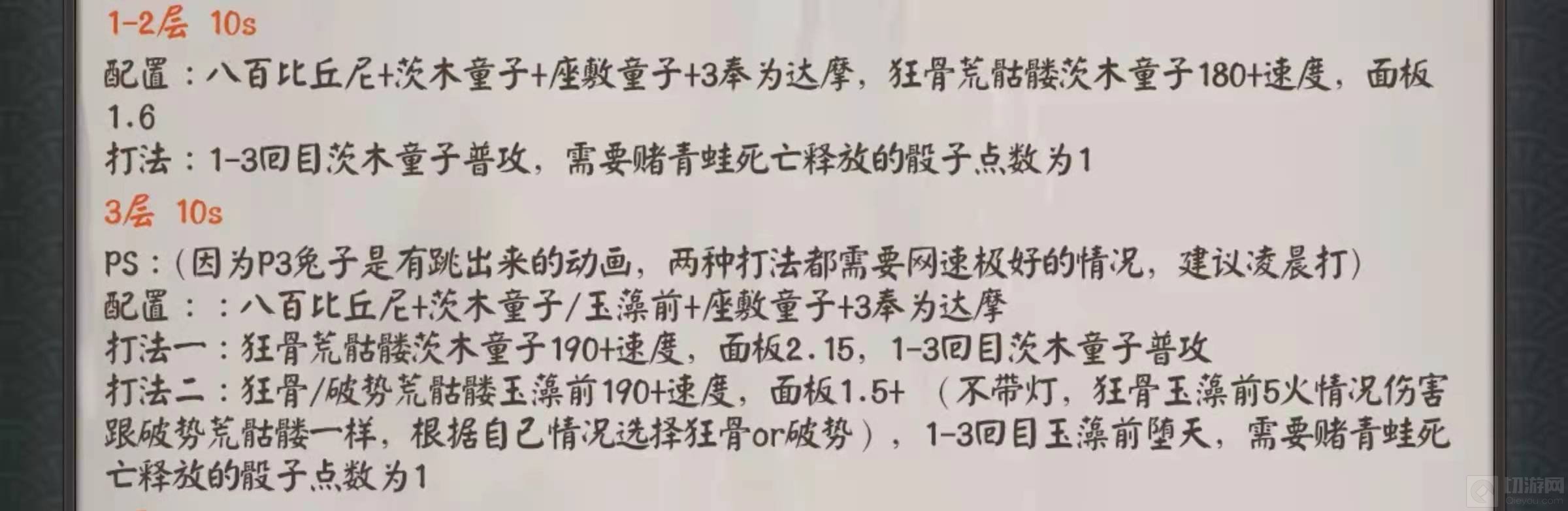 2.7-10层:这3层因为涉及到了地藏御魂的设定,打起来比较困难,这里推荐一个无脑挂机阵容—阴阳师晴明 三鸩 椒图 日和坊。常规多鸩体系可以快速通关,配合椒图和日和坊可以完成无脑挂机通关,御魂方面建议携带地藏能保证绝对的安全。如果没有三鸩,可以换成樱花。注意:第2回合,不要让阴阳师被蛤蟆炸死,死了就完了。
