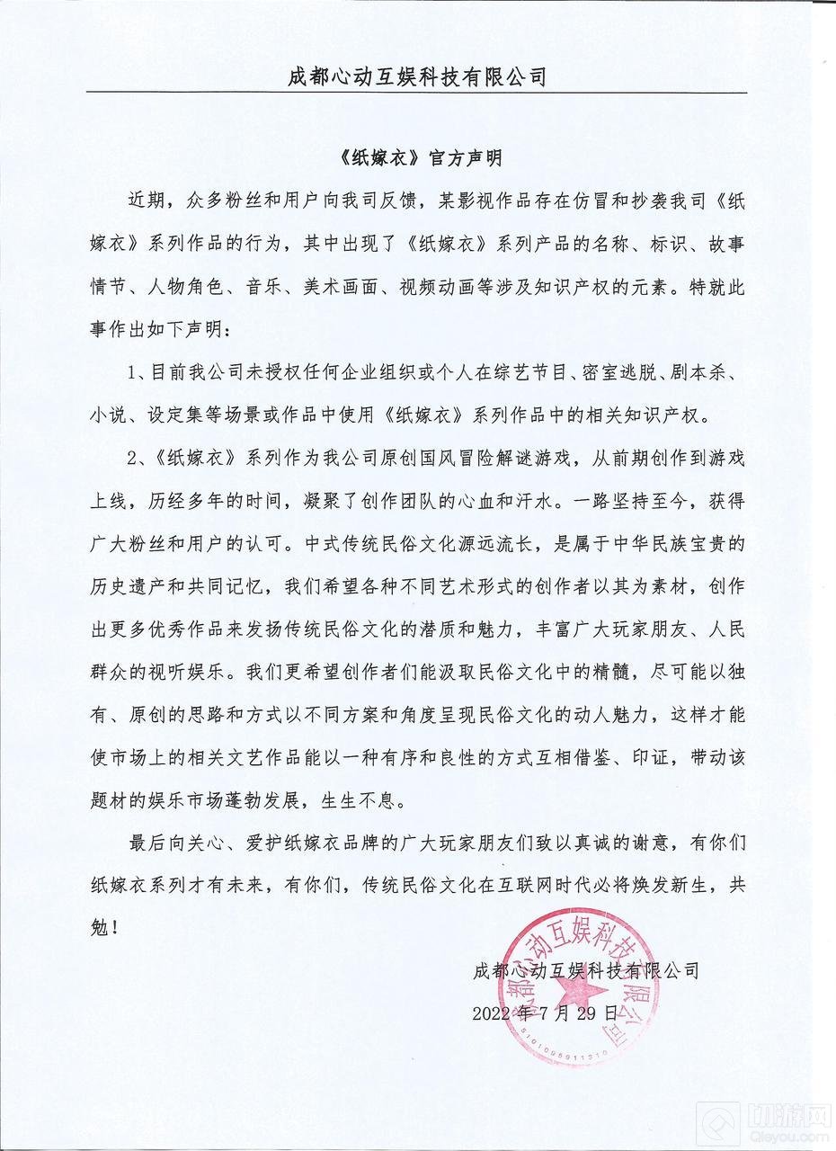 7月29日,纸嫁衣工作室公布关于近期舆论事件的声明,声明疑似回应涉嫌抄袭综艺:目前我公司未授权任何企业组织或个人在综艺节目、密室逃脱、剧本杀小说、设定集等场景或作品中使用《纸嫁衣》系列作品中的相关知识产权。