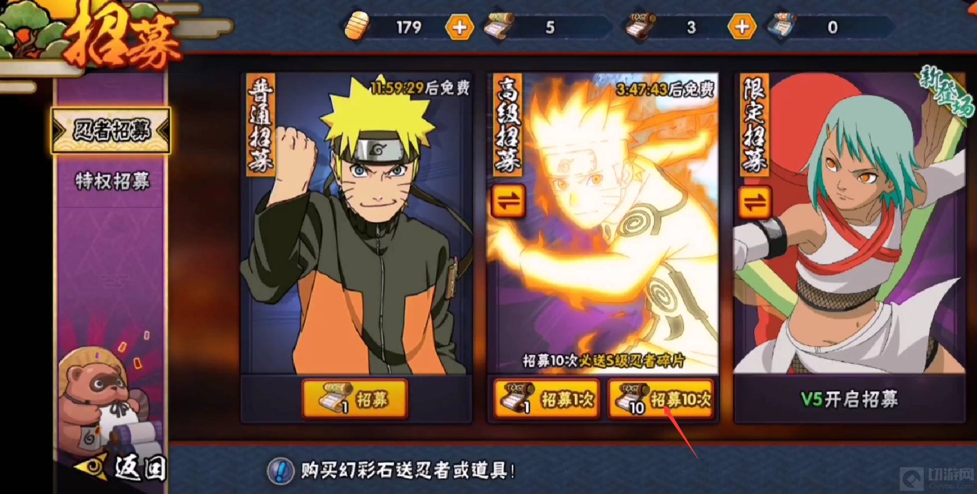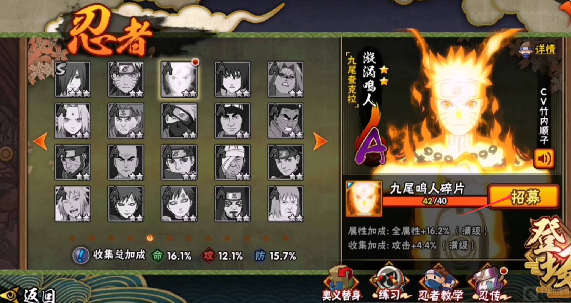 1.在火影忍者游戏的高级招募中,可以抽到金鸣碎片,建议玩家10连招募,必送S级忍者碎片。