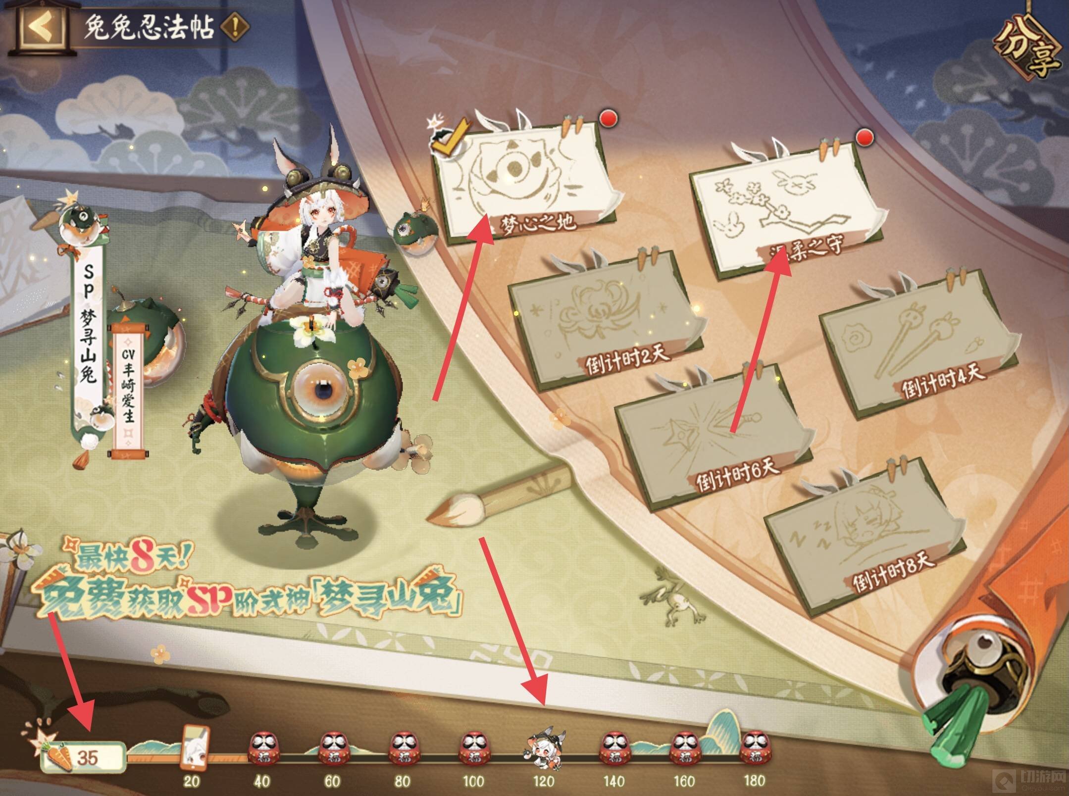 阴阳师现在有一个兔兔忍法帖的活动,可以从庭院进入,每天完成里面的任务,完成任务可以获得胡萝卜糖,当胡萝卜糖达到120个时,可以免费获得sp梦寻山兔。