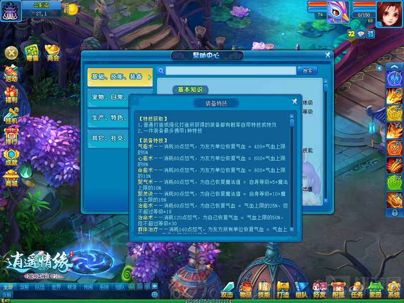 我来说几个效果比较霸道的装备特技吧,比方说有能够让全队成员瞬间恢复气血的群体治疗,有能够逆风翻盘的复活型特技群体重生,还有强力的输出型特技嗜血连击等等。这些特技的效果都可以在帮助中心里查看到,常用的一定要记牢哦。