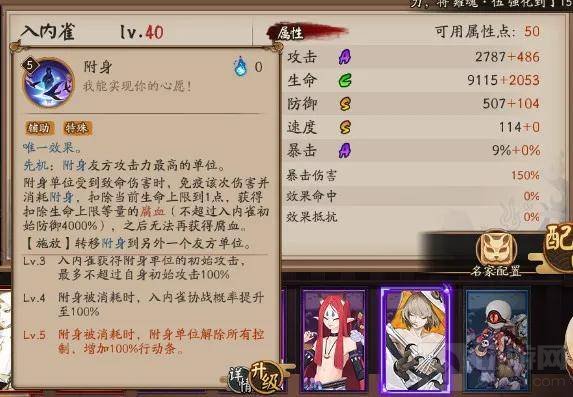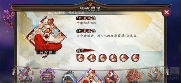 (2)从技能上来看入内雀并不适合打输出而他的技能效果又与自身的防御力的大小挂钩,所以首选辅助御魂中的万金油招财猫恰好很合适既能提高自身的防御力又可以每回合有几率为队伍提供魂火支持2全齐美。