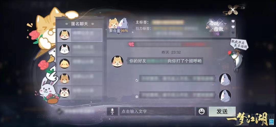 通过“西皮滴滴”或主动发起,成功开启一段浪漫又神秘的匿名聊天后,少侠便能通过语音、文字、表情、实时语音等形式与对方进行沟通。此外天机阁还在1V1专属匿名聊天界面中,配备了贴心破冰小对话,让“大树桔”帮你找话题!匿名聊天中,少侠还可以通过界面显示获知自己与对方的匹配度和心跳指数,双方的性格契合度越高匹配度就越高,而心跳指数则与少侠们的聊天频率与对话数量息息相关!